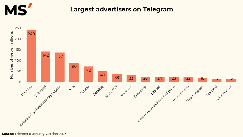 When looking at investments, the picture becomes even more illustrative. Rozetka invests between UAH 6.5 and 11.2 million in Telegram, creating the highest advertising pressure within the platform. Orlovskyi and Kyiv University of Culture operate in the range of UAH 3.7–6.6 million, while most other brands remain below UAH 4 million. This reflects not only differences in budget scale, but also different roles Telegram plays in the media mix — from a branding channel to a stable performance-driven tool.