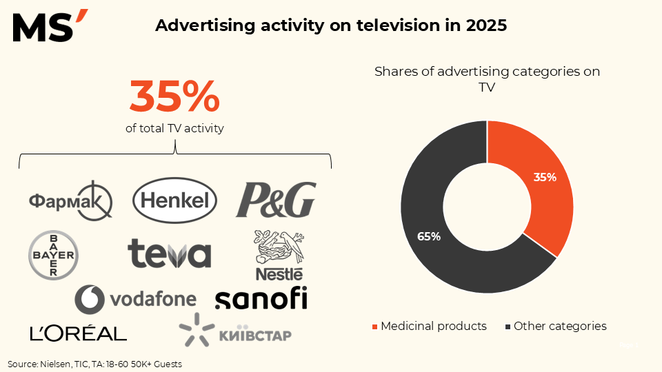 The structure of television advertising in 2025 clearly shows the dominance of the pharmaceutical category. Medicinal products account for about 35% of all advertising activity on TV, making them the most influential driver of inventory. Such a concentration of budgets not only increases media pressure but effectively sets the pace of the market for other categories.