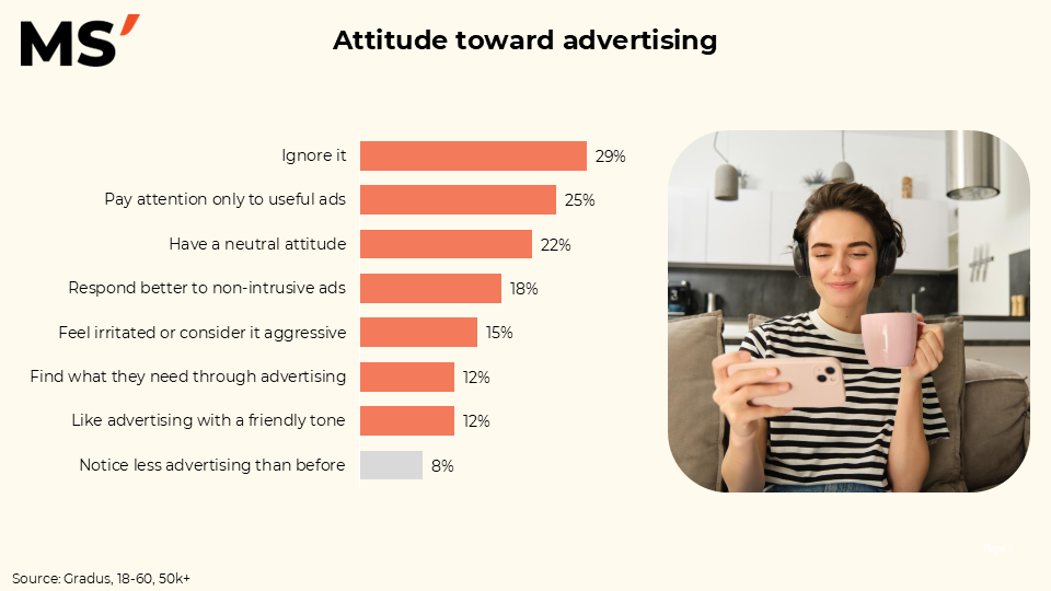 29% of the audience openly ignore advertising, while another 22% remain neutral. That means more than half show no active interest. At the same time, 25% pay attention only to what delivers practical value — bringing the focus back to substance rather than form.