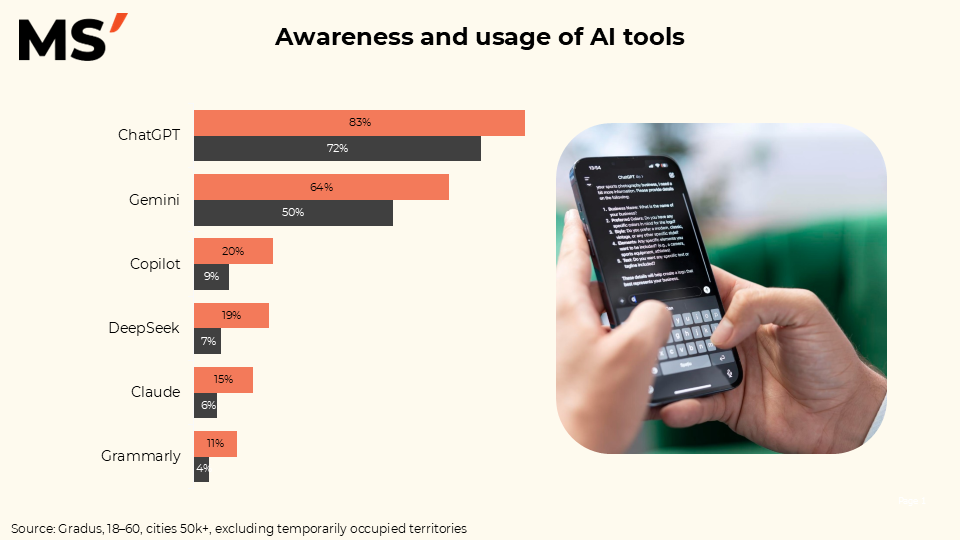 ChatGPT has the highest levels of both awareness (83%) and usage (72%), making it the clear leader. Gemini ranks second — 64% awareness and 50% usage. Then there is a significant gap: Copilot — 20% awareness and 9% usage, DeepSeek — 19% and 7%, Claude — 15% and 6%, Grammarly — 11% and 4%.