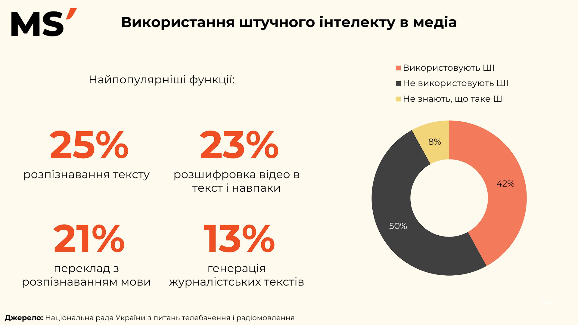 Найчастіше медіа використовують ШІ для розпізнавання тексту (25%) — автоматизація цієї функції допомагає прискорювати обробку великих масивів інформації. На другому місці — розшифровка відео у текст і навпаки (23%), що особливо актуально для редакцій із великим відеоконтентом.