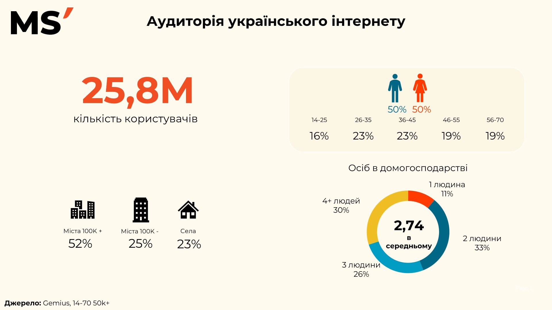 У середньому домогосподарство інтернет-користувача складається з 2,74 осіб: 33% живуть удвох, 26% — утрьох, а 30% — у великих родинах із чотирма і більше людьми. Така структура впливає на споживання контенту, адже пристрої та підписки часто використовуються спільно.