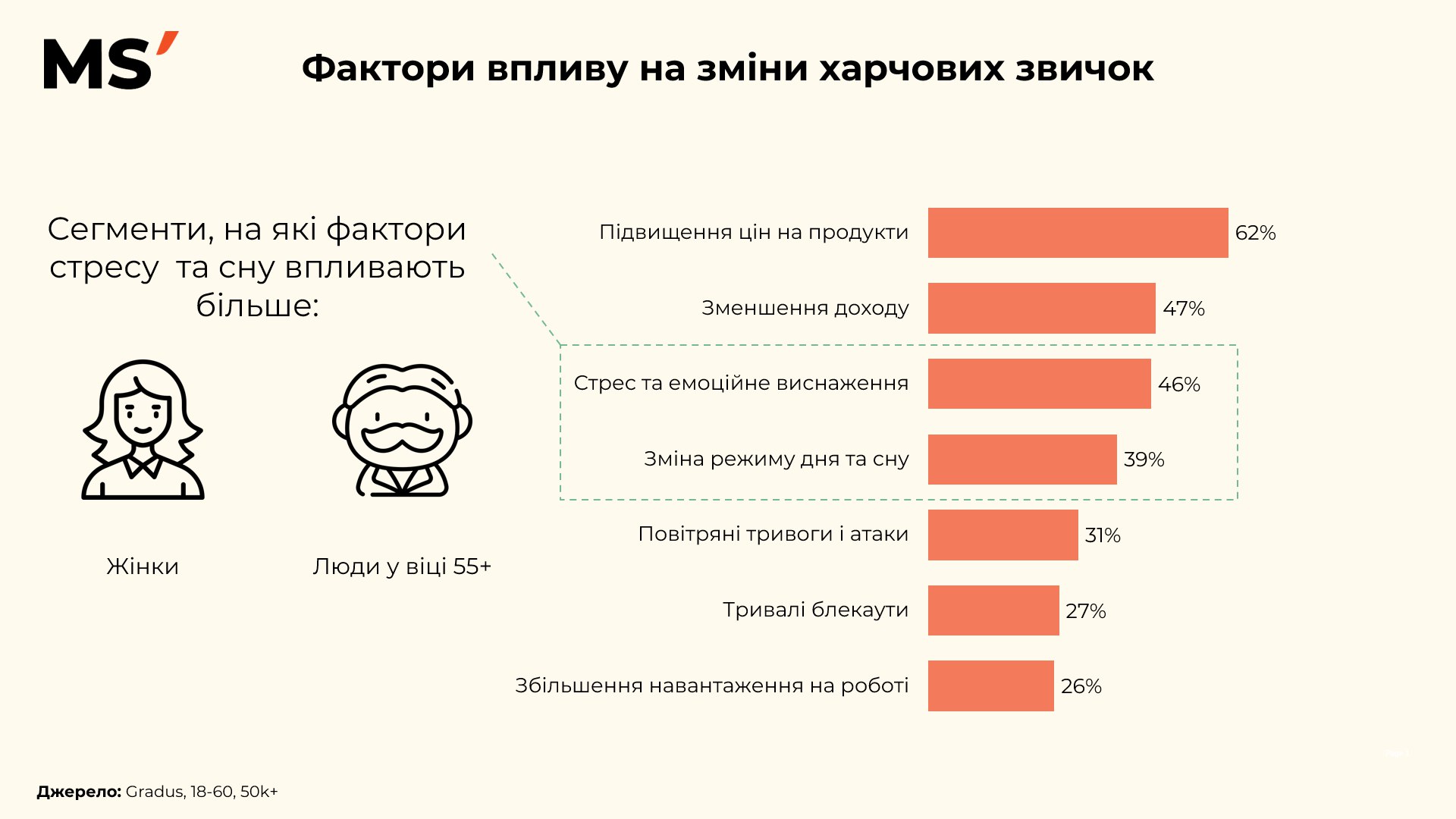 Зміна харчових звичок українців дедалі більше відображає соціально-психологічний стан суспільства. За останній рік головним чинником впливу залишається підвищення цін на продукти — 62% респондентів відзначають саме цей фактор. Він безпосередньо формує нову культуру споживання — відмову від зайвих витрат, пошук акцій та перехід на більш економні бренди.