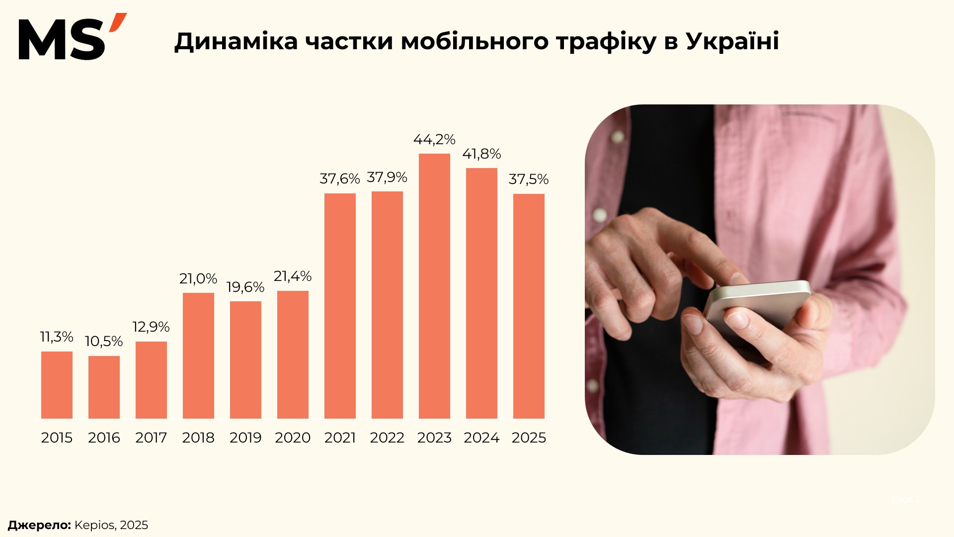Якщо подивитися на динаміку останніх років, стає очевидно: мобільний трафік уже давно перестав бути стабільно зростаючим показником. Після тривалого періоду підйому, який тривав до 2023 року і досяг піку в 44,2%, його частка почала плавно зменшуватися. У 2024 році вона склала 41,8%, а у 2025 році — 37,5%.
