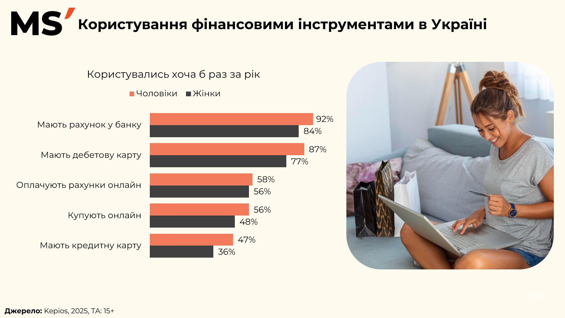 Найпоширеніший інструмент — банківський рахунок. Наявність рахунку мають 92% чоловіків і 84% жінок. Це фактично стандарт, без якого сучасні фінансові операції вже не уявити. Слідом — дебетові картки: ними володіють 87% чоловіків і 77% жінок. Ці показники підтверджують, що платіжні інструменти в Україні стали універсальним інструментом незалежно від статі.