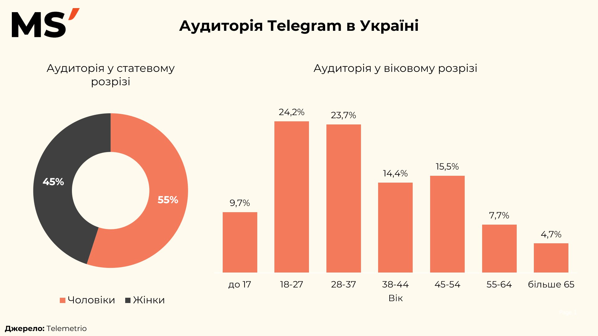 55% аудиторії Telegram в Україні — чоловіки, 45% — жінки. Це майже збалансований гендерний розподіл, який відкриває можливості для широкого спектра категорій — від фінансів і tech до FMCG та e-commerce.