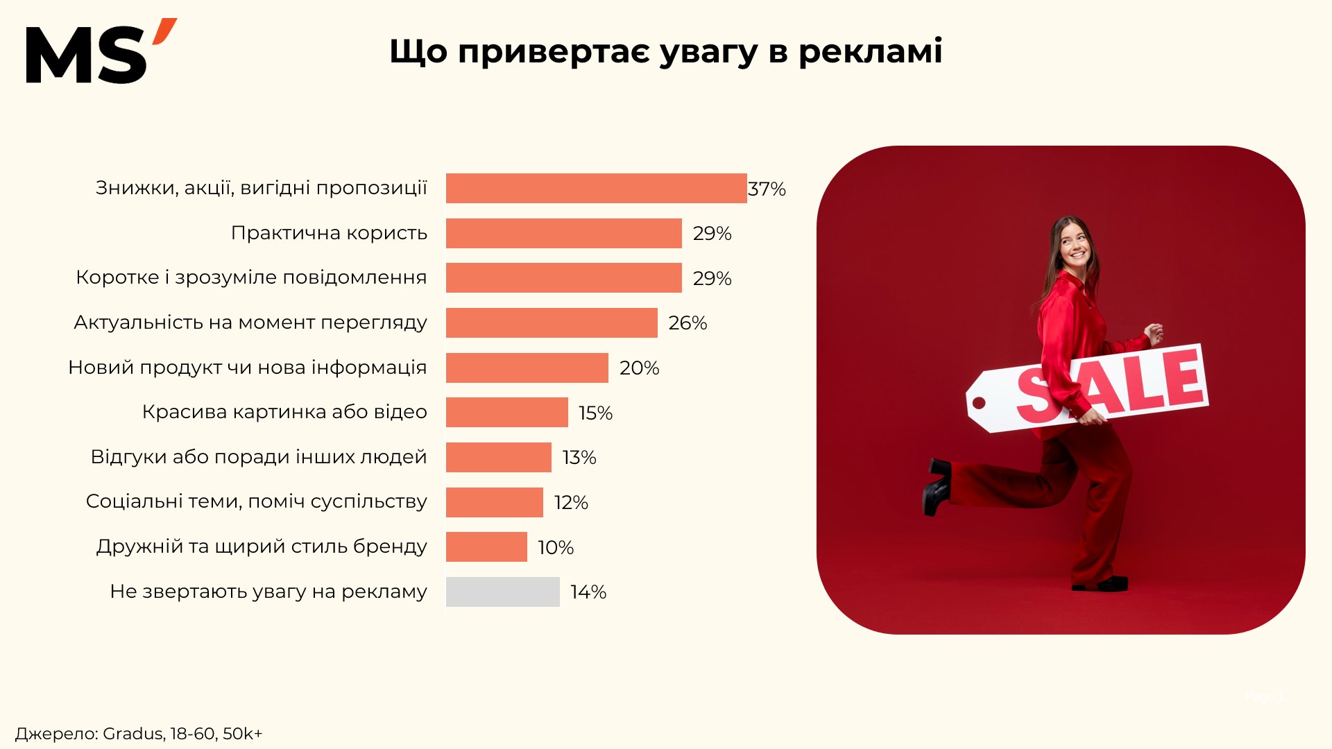 Соціальні теми, рекомендації інших людей і тон комунікації бренду знаходяться ще нижче. І водночас 14% взагалі не звертають уваги на рекламу.